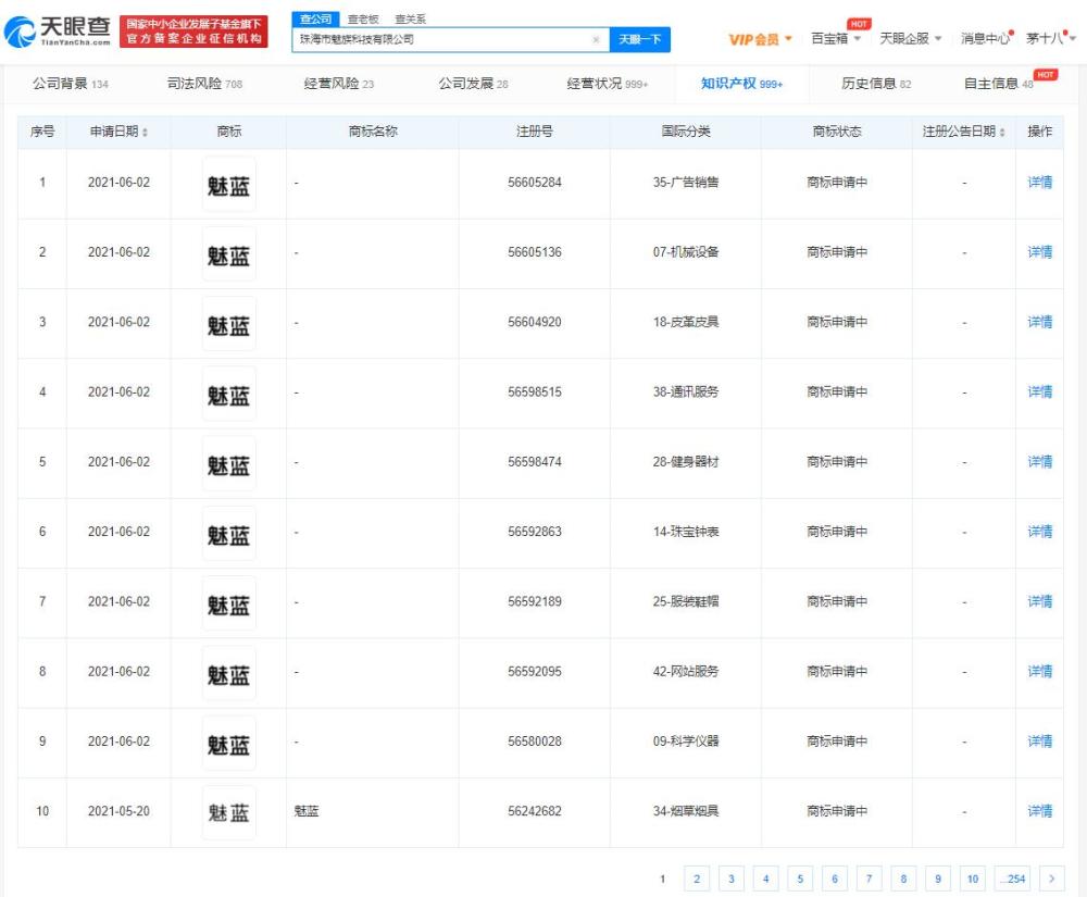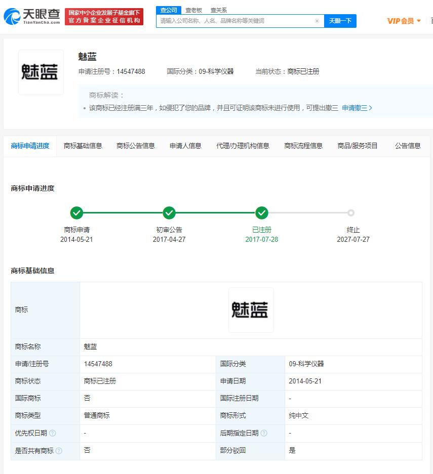 近日,珠海市魅族科技有限公司再次申请注册“魅蓝”商标,国际分类涉及通讯服务、科学仪器、广告销售、网站服务等,目前商标状态均为申请中。